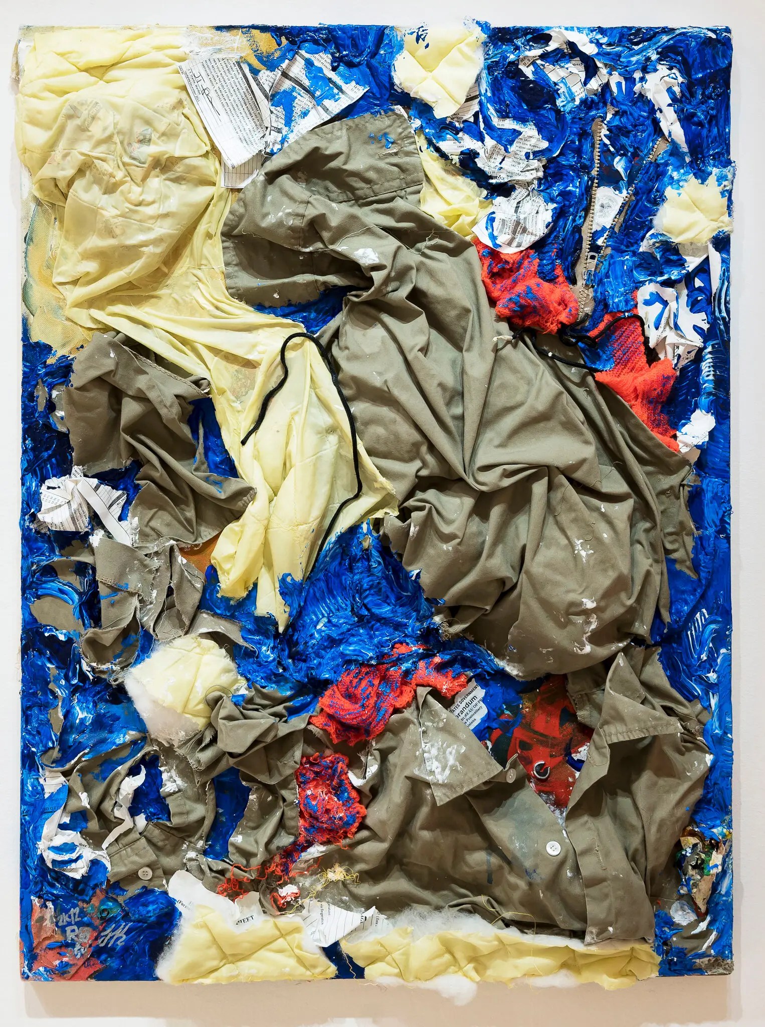 An Institutional Nightmare, a mixed media piece created by Gilberto Rivera in 2012 while incarcerated. Composed of federal prison uniforms, commissary papers, floor wax, prison reports, newspaper, and acrylic on canvas.