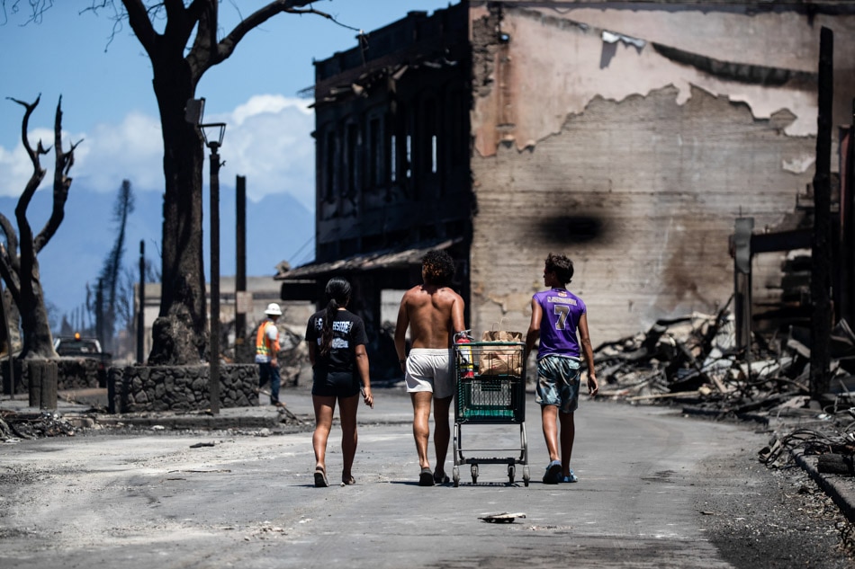 On the top is a picture of Lahaina natives walking among ruins after the wildfire.